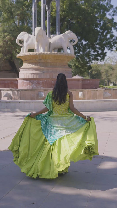 The kaftan silhouette offers a relaxed, fluid fall with an asymmetric one-shoulder neckline. Crafted in traditional Bandhani print, it blends refreshing shades of lime green, lemon yellow, mint, and teal, arranged in fine dotted and striped patterns that reflect artisanal craftsmanship.
